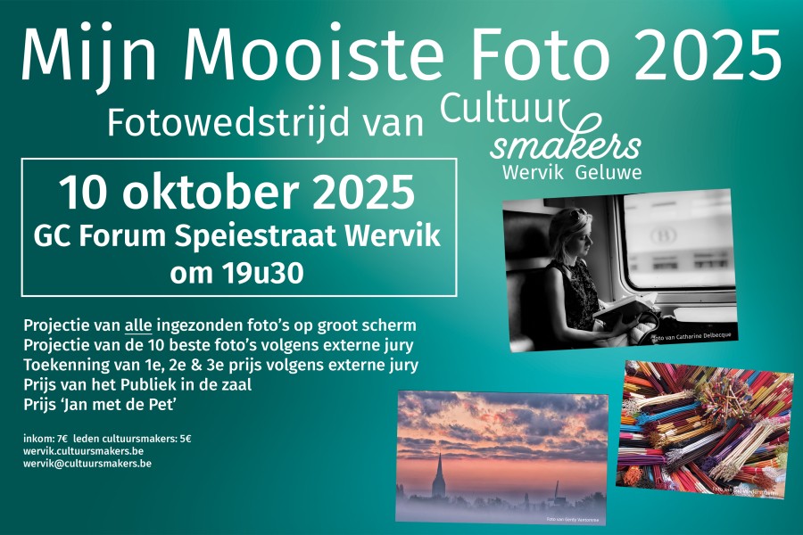 Fotowedstrijd. 2 categorieën: Starters & Ervaren. 2 reeksen: Cultuur & Vrij Onderwerp. Projectie in GC Forum in Wervik op 10 oktober 2025.